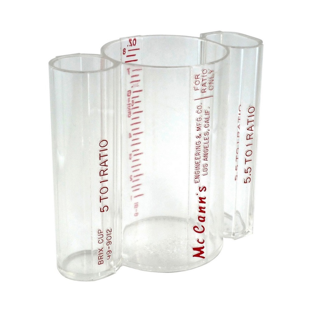 Used to measure the ratio of syrup to water in a drink. A syrup separator is attached to the head of the valve and the brix cup is placed below the separator. When the valve is engaged, syrup should flow into the smaller tube while water should flow into the larger tube.